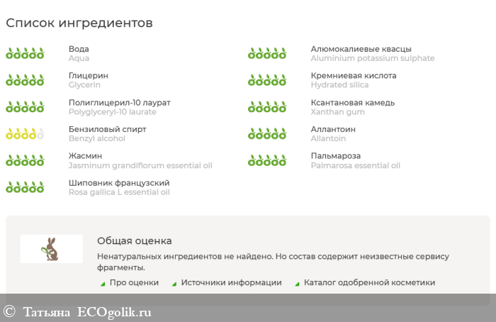 Aqua (вода дистиллированная), Aluminium potassium sulphate (квасцы алюмокалиевые), Glycerin (глицерин), Hydrated silica (диоксид кремния), Polyglyceryl-10 laurate* (полиглицерил-10 лаурат), Xanthan gum (ксантановая камедь), Benzyl alcohol (бензиловый спирт), Allantoin (аллантоин), Jasminum grandiflorum essential oil (эфирное масло жасмина), Palmarosa essential oil (эфирное масло пальмарозы), Rosa gallica L. essential oil (эфирное масло розы), Amyris essential oil (эфирное масло сандала)