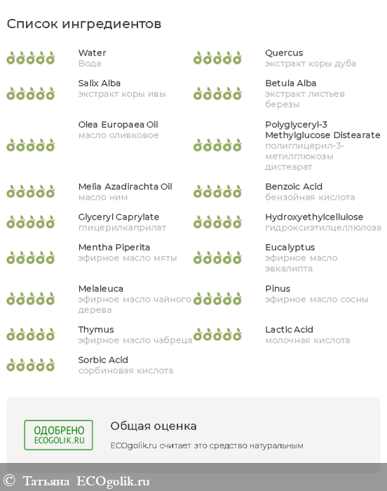 Вода, экстракт коры дуба, экстракт коры ивы, экстракт листьев березы, масло оливковое, полиглицерил-3-метилглюкозы дистеарат, масло ним, бензойная кислота, глицерилкаприлат, гидроксиэтилцеллюлоза, эфирное масло мяты, эфирное масло эвкалипта, эфирное масло чайного дерева, эфирное масло сосны, эфирное масло чабреца, молочная кислота, сорбиновая кислота.