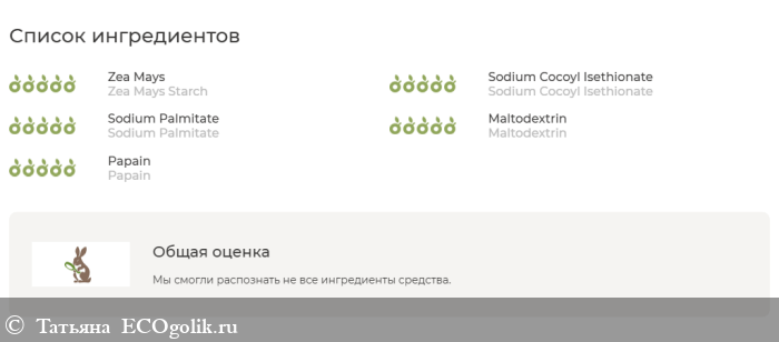Вот так выглядит состав: Zea Mays (Corn) Starch, Sodium Cocoyl Isethionate, Sodium Palmitate, Diglycerin Allantoin, Maltodextrin, Papain