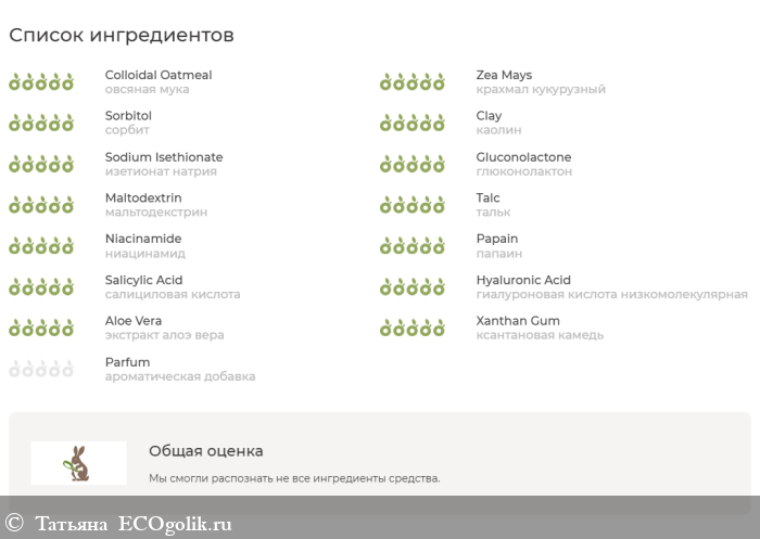 Состав: рисовый шелк, овсяная мука, крахмал кукурузный, сорбит, каолин, изетионат натрия, глюконолактон, мальтодекстрин, тальк, ниацинамид (витамин В3), папаин, салициловая кислота, гиалуроновая кислота низкомолекулярная, экстракт алоэ вера, ксантановая камедь, ароматическая добавка.