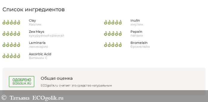 Каолин, инулин, кукурузный крахмал, папаин, ламинария, бромелайн, Витамин С.