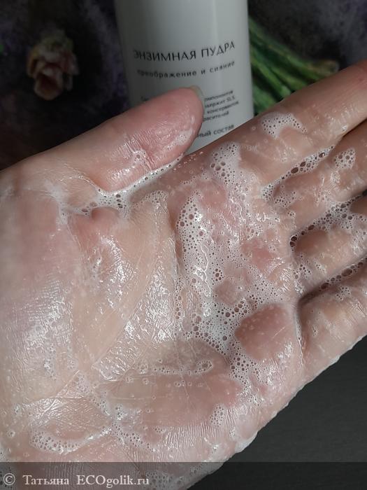 Я использую энзимную пудр 2-3 раз в неделю. Высыпаю небольшое количество на ладонь, добавляю воды и вспениваю, а затем переношу пенку на кожу лица.