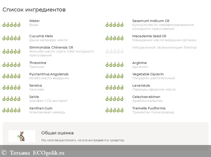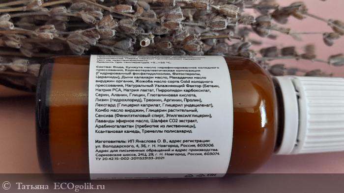 Вода, Кунжута масло нерафинированное холодного прессования, Корнеотерапевтическая композиция (Гидрированный фосфатидилхолин, Фитостеролы, Церамиды), Дыни калахари масло, Макадамии масло вирджин органик, Жожоба масло сорта Gold холодного прессования, Натуральный Увлажняющий Фактор (Бетаин, Натрия РСА, Натрия лактат, Пирролидон карбоксилат, Серин, Аланин, Глицин, Глютаминовая кислота, Лизин (гидрохлорид), Треонин, Аргинин, Пролин), Комбо масло вирджин, Глицерин растительный, Сенсива (Фенилэтиловый спирт, Этилгексилглицерин), Лаванды эфирное масло, Шалфея CO2 экстракт, Арабиногалактан (пребиотик из лиственницы), Ксантановая камедь, Тремеллы полисахарид