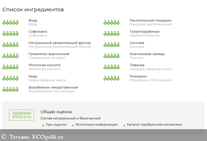 Вода, Глицерин растительный, Софольянс (Пробиотик: Фермент гриба Бомбикола/Глюкоза/Метил фермента рапса), Арабиногалактан (пребиотик), Натуральный Увлажняющий Фактор (Бетаин, Натрия РСА, Натрия лактат, Пирролидон карбоксилат, Серин, Аланин, Глицин, Глютаминовая кислота, Лизин (гидрохлорид), Треонин, Аргинин, Пролин), Сенсива (Фенилэтиловый спирт, Этилгексилглицерин), Гамамелиса экстракт, Ксантан, Молочная кислота, Лаванды эфирное масло, Кедра эфирное масло, Розмарина эфирное масло, Розмарина СО2 экстракт, Воробейника СО2 экстракт.