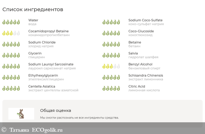 вода, коко-сульфат натрия, кокамидопропилбетаин, кокоглюкозид, хлорид натрия, бетаин, глицерин, гидролат шалфея, лауроил саркозинат натрия, бензиловый спирт, этилгексилглицерин, экстракт лимонника, экстракт центеллы азиатской, лимонная кислота, композиция эфирных масел
