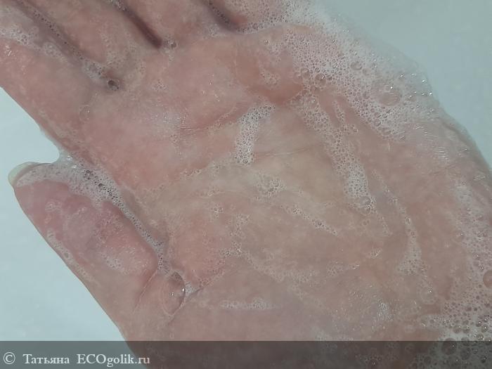 Гель хорошо пенится, даже отлично. Не смотря на то, что он жидковат расход получается совсем небольшим. Так как пенки много и она пышная! А если использовать мочалку, то совсем супер!
