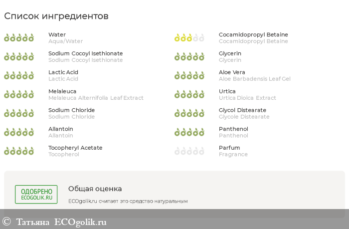 Aqua/Water (вода), Cocamidopropyl Betaine (мягкое ПАВ на растительной основе)*, Sodium Cocoyl Isethionate (мягкое ПАВ на растительной основе)*, Glycerin (глицерин), Lactic Acid (молочная кислота)*, Aloe Barbadensis Leaf Gel (гель алоэ-вера)*, Melaleuca Alternifolia (Tea Tree) Leaf Extract (экстракт зеленого чая)*, Urtica Dioica Extract (экстракт крапивы)*, Sodium Chloride (загуститель)*, Glycole Distearate (смягчающее средство), Allantoin (аллантоин)*, Panthenol (пантенол)*, Tocopherol (витамин Е)*, Fragrance (ароматизатор).