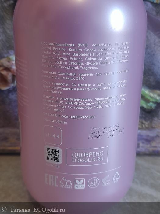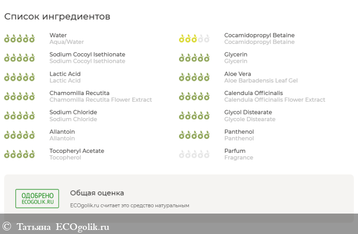 Aqua/Water (вода), Cocamidopropyl Betaine (мягкое ПАВ на растительной основе)*, Sodium Cocoyl Isethionate (мягкое ПАВ на растительной основе)*, Glycerin (глицерин), Lactic Acid (молочная кислота)*, Aloe Barbadensis Leaf Gel (гель алоэ-вера)*, Chamomilla Recutita Flower Extract (экстракт ромашки)*, Calendula Officinalis Flower Extract (экстракт календулы)*, Sodium Chloride (загуститель)*, Glycole Distearate (смягчающее средство), Allantoin (аллантоин)*, Panthenol (пантенол)*, Tocopherol (витамин Е)*, Fragrance (ароматизатор).