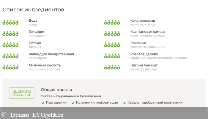 вода, кокоглюкозид, глицерин, ксантановая камедь, бетаин, экстракты ромашки и календулы, эфирное масло розового дерева, молочная кислота, бензоат натрия