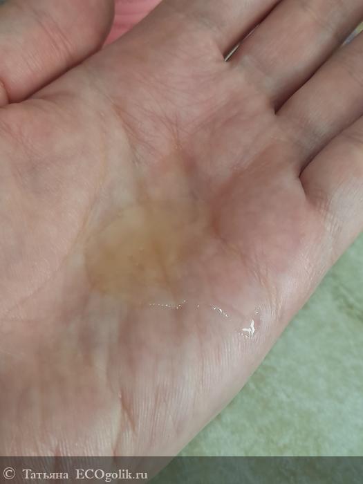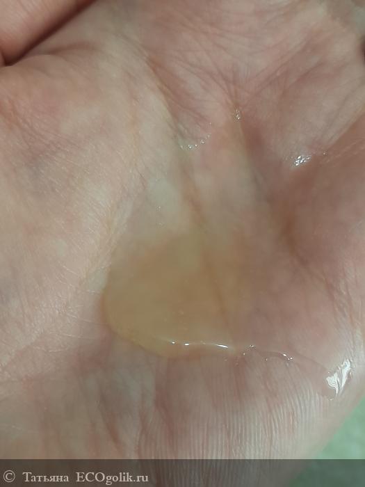 Средство имеет гелеобразную текстуру, консистенция средней густоты, однородная. Гель бесцветный, прозрачный с легким золотистым оттенком.