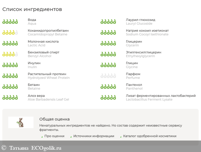 Aqua, Lauryl Glucoside, Cocamidopropyl Betaine, Sodium Cocoyl Isethionate, Lactic Acid, Glycerin, Benzyl Alcohol, Ethylhexylglycerin, Inulin, Sodium Сitrate, Glycine, Hydrolyzed Wheat Protein, Perfume, Betaine, Panthenol, Aloe Barbadensis (Aloe Vera) Leaf Gel, Lactobacillus Ferment Lysate, Chamomilla Recutita Flower Exctract.