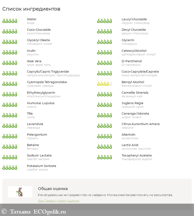 вода, лаурил глюкозид, гидролат зеленого чая, кокоглюкозид, децил глюкозид, глицерил олеат, глицерин, инулин, цетеариловый спирт, алое вера гель, D-пантенол, каприлик/каприк триглицериды, коко-каприлат/капрат, гуаровая камедь, бензиловый спирт, этилгексилглицерин, экстракты: зеленый чай, хмель, грецкий орех, каштан, липа; эфирные масла: иланг-иланг, лаванда, нероли, герань; аллантоин, бетаин, молочная кислота, лактат натрия, гиалуронат натрия низкомолекулярный (50 кда.), токоферола ацетат (витамин Е), сорбат калия.