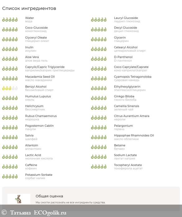 вода, лаурил глюкозид, гидролат бессмертника, кокоглюкозид, децил глюкозид, глицерил олеат, глицерин, инулин, цетеариловый спирт, алое вера гель, D-пантенол, каприлик/каприк триглицериды, коко-каприлат/капрат, масло макадамии, гуаровая камедь, бензиловый спирт, этилгексилглицерин, экстракты: хмель, каштан, гинкго-билоба, бессмертник, зеленый чай, морошка; эфирные масла: нероли, пачули, герань, шалфей; масло облепихи, аллантоин, бетаин, молочная кислота, лактат натрия, автолизат дрожжей, кофеин, гиалуронат натрия низкомолекулярный (50-5 кда.), токоферола ацетат (витамин Е), сорбат калия.