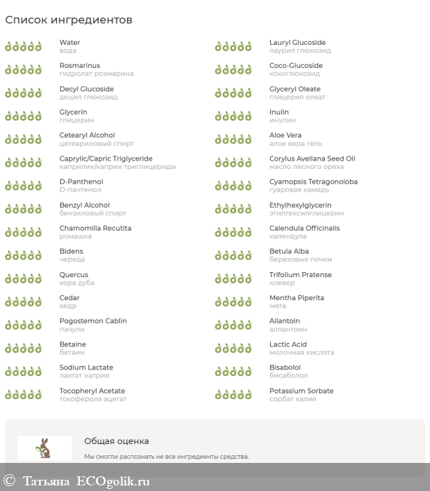 вода, лаурил глюкозид, гидролат розмарина, кокоглюкозид, децил глюкозид, глицерил олеат, глицерин, инулин, цетеариловый спирт, алое вера гель, каприлик/каприк триглицериды, масло лесного ореха, D-пантенол, гуаровая камедь, бензиловый спирт, этилгексилглицерин, экстракты: хвощ, ромашка, календула, череда, березовые почки, кора дуба, кора ивы, клевер; эфирные масла: кедр, мята, пачули; аллантоин, бетаин, молочная кислота, лактат натрия, бисаболол, автолизат дрожжей, токоферола ацетат (витамин Е), сорбат калия.