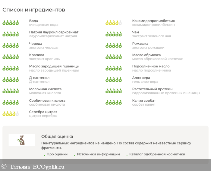 Вот так выглядит состав: очищенная вода, кокамидопропилбетаин, лауроилсаркозинат натрия, экстракт зеленого чая, экстракт череды, экстракт ромашки, экстракт крапивы, масло абрикосовой косточки, масло зародышей пшеницы, масло подсолнечника, Д-пантенол, гель алоэ-вера, молочная кислота, гидролизованные протеины пшеницы, сорбиновая кислота, сорбат калия, цитрат серебра, натуральная пищевая отдушка с гипоаллергенным статусом.