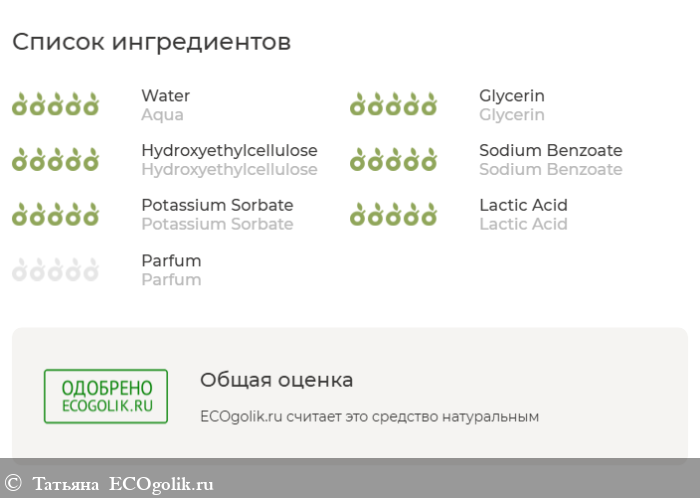 Aqua (вода), Glycerin (глицерин), Hydroxyethylcellulose (натуральный регулятор вязкости), Sodium Benzoate (бактерицидное и противогрибковое средство), Potassium Sorbate (консервирующий компонент), Lactic Acid (молочная кислота, регулятор pH), Parfum (пищевой ароматизатор).