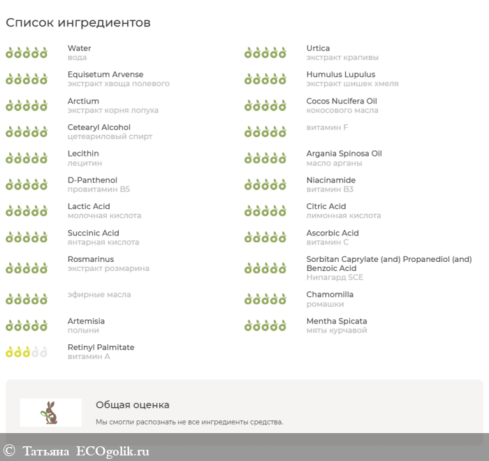 Aqua with infusions of Serenoa Serulata Fruit (экстракт пальмы Сабаля), Centella asiatica (экстракт готу-колы), Urtica Dioica (экстракт крапивы), Equisétum Arvénse (экстракт хвоща полевого), Humulus lupulus (экстракт шишек хмеля), Árctium lappa (экстракт корня лопуха), decyl glucoside (5% Mousse de sucre*), Cetearyl alcohol (цетеариловый спирт), Ethyl Esters of Linoleic (and) Linolenic Acids (витамин Ф), EQ-65 Distearoylethyl Dimonium Chloride** (кондиционер растительного происхождения), lactitol (пребиотик из молочного сахара), Lecithin (нат. лецитин), Argania Spinosa Kernel Oil (масло арганы), Panthenol (провитамин В5), Arginine (натур. аминокислота аргинин), Lactic Acid (молочная кислота), Tocotrienol, Tocopherol (натуральный витамин Е), Citric Acid (лимонная кислота), Succinic Acid (янтарная кислота), L-Ascorbic Acid (витамин С), natural preservatives: