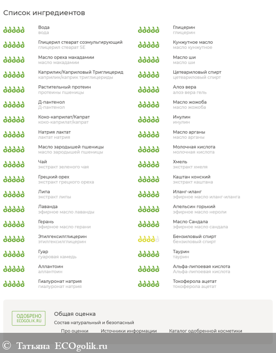 Состав 100% натуральный: вода, гидролат зеленого чая, глицерин, глицерил стеарат SE, масло кунжутное, масло макадамии, масло ши, каприлик/каприк триглицериды, цетеариловый спирт, протеины пшеницы, алоэ вера гель, Д-пантенол, масло жожоба, коко-каприлат/капрат, инулин, лактат натрия, масло арганы, масло зародышей пшеницы, молочная кислота, экстракты: зеленый чай, хмель, грецкий орех, каштан, липа; эфирные масла: иланг-иланг, лаванда, нероли, герань, сандал; этилгексилглицерин, бензиловый спирт, гуаровая камедь, таурин, аллантоин, А-липоевая кислота, гиалуронат натрия (гиалуроновая кислота 500-5кда.), токоферола ацетат (Витамин Е)