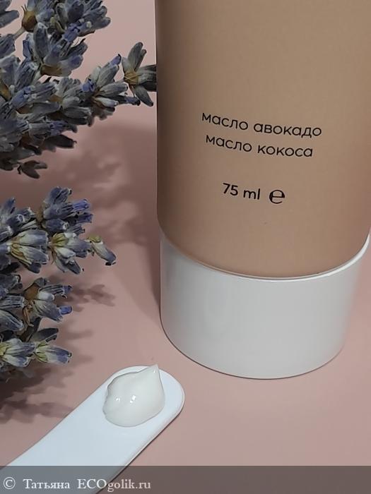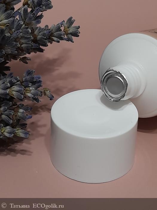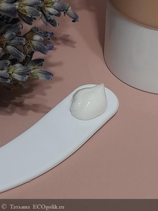 Крем достаточно густой, имеет однородную текстуру. Он белого цвета с легким бежевым оттенком. Аромат очень приятный.