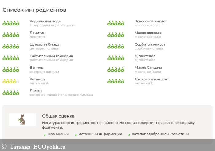 Природная вода Мацеста, масло кокоса, лецитин, масло авокадо, цетеарил оливат*, сорбитан оливат* растительный глицерин, Д-пантенол, экстракт ванили, масло сандала, витамин А, витамин Е, эфирное масло испанского лимона, бензиловыйспирт*,этилгексил-глицерин** *(*Натуральные консерванты).
