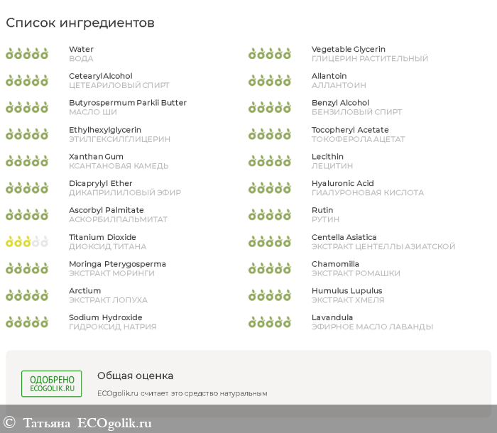 ВОДА, ГЛИЦЕРИН РАСТИТЕЛЬНЫЙ, ЦЕТЕАРИЛОВЫЙ СПИРТ, АЛЛАНТОИН, МАСЛО ШИ (КАРИТЕ), БЕНЗИЛОВЫЙ СПИРТ, ЭТИЛГЕКСИЛГЛИЦЕРИН, ТОКОФЕРОЛА АЦЕТАТ (ВИТАМИН Е), КСАНТАНОВАЯ КАМЕДЬ, ЛЕЦИТИН, ДИКАПРИЛИЛОВЫЙ ЭФИР, ГИАЛУРОНОВАЯ КИСЛОТА, АСКОРБИЛПАЛЬМИТАТ, РУТИН (ВИТАМИН Р), ДИОКСИД ТИТАНА (CL 77891), ЭКСТРАКТ ЦЕНТЕЛЛЫ АЗИАТСКОЙ, ЭКСТРАКТ МОРИНГИ, ЭКСТРАКТ РОМАШКИ, ЭКСТРАКТ ЛОПУХА, ЭКСТРАКТ ХМЕЛЯ, ГИДРОКСИД НАТРИЯ, ЭФИРНОЕ МАСЛО ЛАВАНДЫ