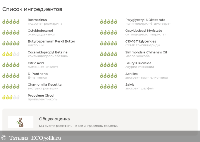Специально подготовленная очищенная вода, гидролат розмарина, гидролат ромашки, гидролат апельсина сладкого, полиглицерил-6 дистеарат, октилдодеканол, октилдодецил миристат, масло ши, С10-18 триглицериды, кокамидопропилбетаин, эфирное масло литсеи кубебы (вербены тропической), масло жожоба, лимонная кислота, лаурил глюкозид, Д-пантенол, экстракт корня эхинацеи, экстракт тысячелистника, экстракт ромашки, экстракт шиповника обыкновенного, экстракт шалфея, пропиленгликоль, натуральная парфюмерная композиция с гипоаллергенным статусом, натуральный пищевой краситель
