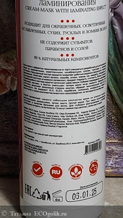 - Крем-маска от AleVi специально разработана для интенсивного ухода за волосами с эффектом ламинирования. Насыщенный состав продукта позволяет добиться видимого результата с первого применения.
