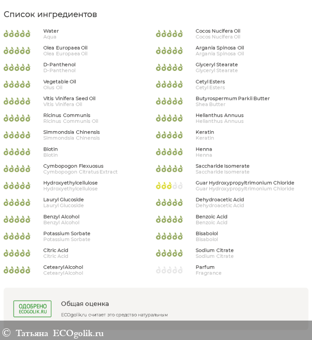 Aqua, Cocos Nucifera Oil, Olea Europaea Oil, Argania Spinosa Oil, D-Panthenol, Glyceryl Stearate, Olus Oil, Cetyl Esters, Vitis Vinifera Oil, Shea Butter, Ricinus Communis Oil, Helianthus Annuus, Simmondsia Chinensis, Keratin, Biotin, Henna, Cymbopogon Citratus Extract, Saccharide Isomerate, Hydroxyethylcellulose, Guar Hydroxypropyltrimonium Chloride, Lauryl Glucoside, Dehydroacetic Acid, Benzyl Alcohol, Benzoic Acid, Potassium Sorbate, Bisabolol, Citric Acid, Sodium Citrate, Cetearyl Alcohol, Fragrance