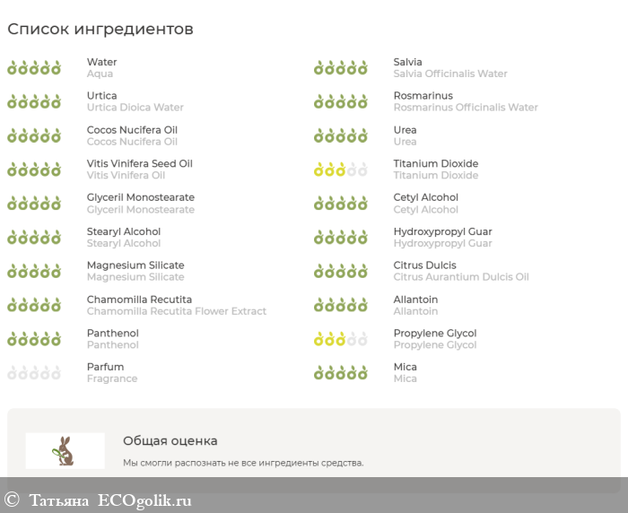 Aqua, Salvia Officinalis Water, Urtica Dioica Water, Rosmarinus Officinalis (Rosemary) Water, Cocos Nucifera Oil, Urea, Vitis Vinifera Oil, Titanium Dioxide, Glyceril Monostearate, Cetyl Alcohol, Stearyl Alcohol, Hydroxypropyl Guar, Magnesium Silicate, Citrus Aurantium Dulcis Oil, Chamomilla Recutita (Matricaria) Flower Extract, Serica Extract, Nelumbo Nucifera (Flower) Extract, Allantoin, Panthenol, Propylene Glycol, Fragrance, Mica