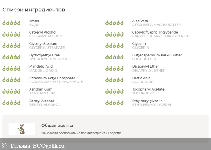 ВОДА, ЦЕТЕАРИЛОВЫЙ СПИРТ, КАПРИЛИК/КАПРИК ТРИГЛИЦЕРИД, ГЛИЦЕРИЛ СТЕАРАТ, ГЛИЦЕРИН, ГИДРОКСИЭТИЛМОЧЕВИНА, ШИ (КАРИТЕ) МАСЛО, АЛОЭ ВЕРА МАСЛО БАТТЕР, МИНДАЛЬНАЯ КИСЛОТА, ДИКАПРИЛИЛОВЫЙ ЭФИР, КАЛИЯ ЦЕТИЛФОСФАТ, МОЛОЧНАЯ КИСЛОТА, КСАНТАНОВАЯ КАМЕДЬ, ТОКОФЕРОЛА АЦЕТАТ (ВИТАМИН E), БЕНЗИЛОВЫЙ СПИРТ, ЭТИЛГЕКСИЛГЛИЦЕРИН AQUA, CETEARYL ALCOHOL, CAPRYLIC /CAPRIC TRIGLYCERIDES, GLYCERYL STEARATE, GLYCERIN, HYDROXYETHYL UREA, SHEA BUTTER, ALOE BARBADENSIS (ALOE VERA) BUTTER OIL, MANDELIC ACID, DICAPRYLYL ETHER, POTASSIUM CETYL PHOSPHATE, LACTIC ACID, XANTHAN GUM, TOCOPHEROL, BENZYL ALCOHOL, ETHYLHEXYLGLYCERIN