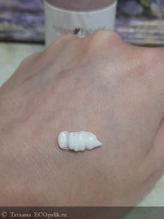 Крем молочного цвета, достаточно густой. По коже распределяется очень легко. Впитываемость замечательная и без остатка. Никакой липкости и жирности нет, чувство пленки тоже полностью отсутствует.