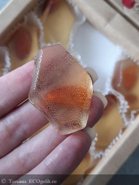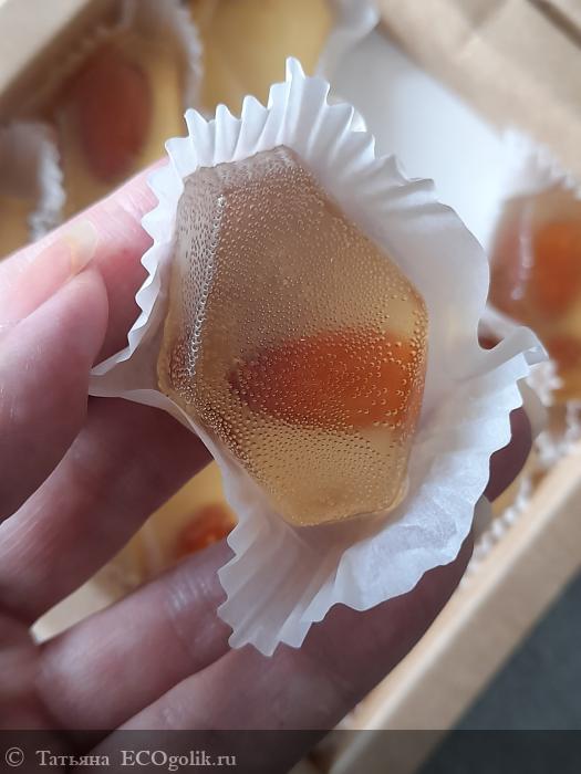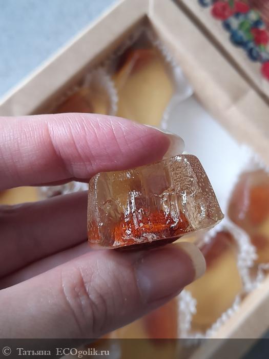 Сам мармелад бесцветный с красивым золотистым оттенком, орех очень хорошо видно.