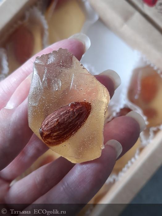 Мармелад плотный, вкуснейший. Нет постороннего вкуса и запаха. Миндаль аппетитно хрустит. Он цельный, свежий.