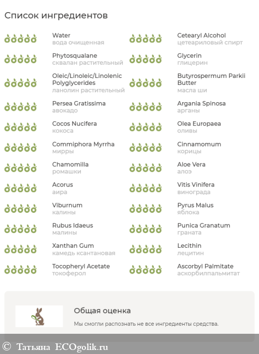 вода очищенная, цетеарилгликозид, цетеариловый спирт, сквалан растительный, глицерин, ланолин растительный, масла ши, авокадо, арганы, хлопка, кокоса, орехов макадамии, оливы, мирры, корицы, каприлилгидроксамовая кислота, гександиол, экстракты зелёного чая, ромашки, алоэ, аира, винограда, калины, яблока, малины, граната, токоферол ацетат, камедь ксантановая, лецитин, токоферол, аскорбилпальмитат