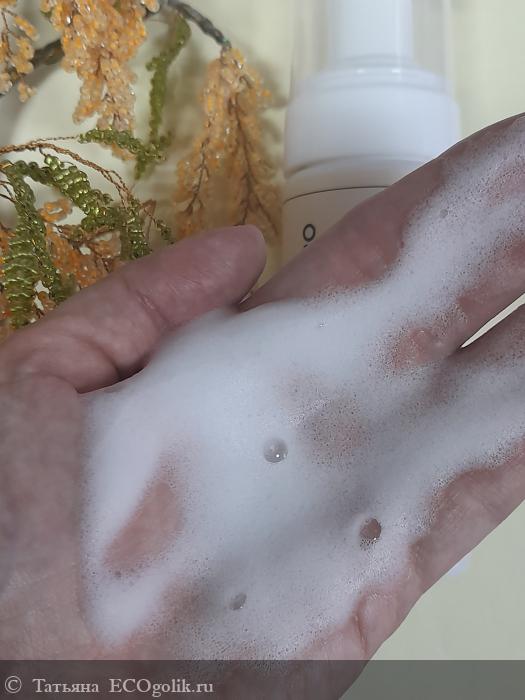 Пенка белоснежная. Воздушная, при этом достаточно плотная. Выраженного аромата нет. Практически никакого аромата нет. По коже распределяется с легкостью, смывается без проблем.