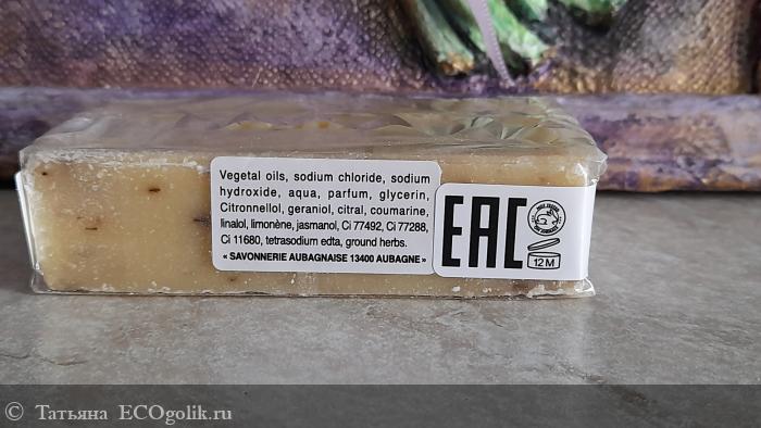 Растительные масла, хлорид натрия, гидроксид натрия, вода, отдушка, глицерин, цитронеллол, гераниол, цитраль, кумарин, линалоол, лимонен, жасманол, Ci77492*, Ci77288*, Ci11680*, тетранатриевая соль, молотые травы *Натуральные пигменты