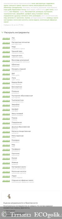 омыленные масла подсолнечника, льна, расторопши, кедрового ореха, грецкого ореха, черного тмина, виноградной косточки, облепихи, миндальное, пихтовое ; экстракты деревьев: кора березы, кора дуба, березовые почки, хвоя кедра, побеги ели, цвет липы, хвоя пихты, лист березы; травы:бессмертник, ромашка, пустырник, тысячелистник, зверобой, шалфей, хвощ полевой, пижма, подорожник, душица, мелисса, мята, розмарин; воск косметический, мед, витамин "Е", прополис, мумие, дигидрокверцитин, живица, масло касторовое, молочная кислота, смола ладана, композиция эфирных масел.