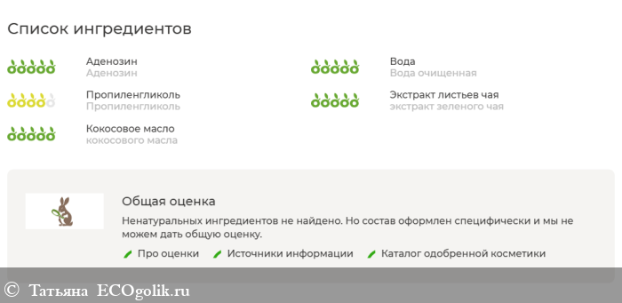 Вода очищенная (Aqua); пропиленгликоль (Propylene Glycol); аденозин (Adenosine); экстракт зеленого чая, сконцентрированный по EGCG (70%