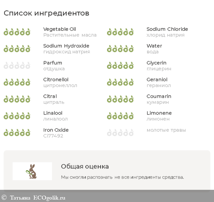 Растительные масла, хлорид натрия, гидроксид натрия, вода, отдушка, глицерин, цитронеллол, гераниол, цитраль, кумарин, линалоол, лимонен, жасманол, Ci77492*, Ci77288*, Ci11680*, тетранатриевая соль, молотые травы *Натуральные пигменты