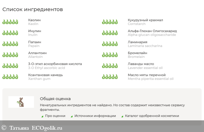 Kaolin (каолин), Cornstarch (кукурузный крахмал), Inulin (инулин), Alpha-glucan oligosaccharide (альфа-глюкан олигосахарид), Sodium сocoyl isethionate (натрия кокоил изетионат), Papain (папаин), Hesperidin сitrus aurantium L. (гесперидин), Laminaria saccharina (ламинария), Allantoin (аллантоин), Bromelain (бромелайн), 3-O Ethyl ascorbic acid (3-0-этил аскорбиновая кислота), Lavender essential oil (эфирное масло лаванды), Xanthan gum (ксантановая камедь), Mentha piperita essential oil (эфирное масло мяты).