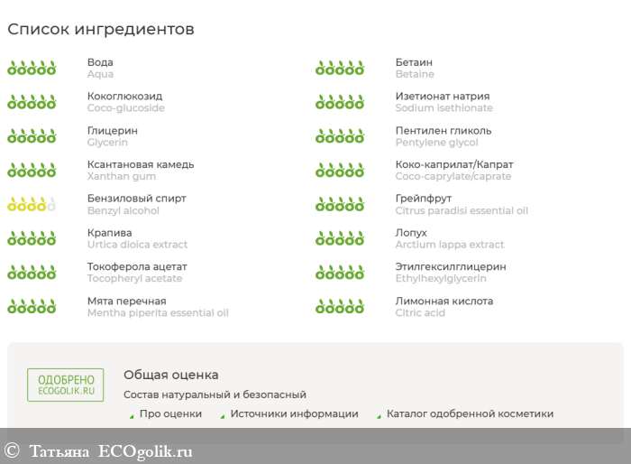 Aqua (вода дистиллированная), Betaine (бетаин), Coco-glucoside (кокоглюкозид), Sodium isethionate (изетионат натрия), Glycerin (глицерин растительный), Pentylene glycol* (пентилен гликоль), Xanthan gum (ксантановая камедь), Coco-caprylate/caprate (коко-каприлат/капрат), Benzyl alcohol (бензиловый спирт), Citrus paradisi essential oil (эфирное масло грейпфрута), Urtica dioica extract (экстракт крапивы), Arctium lappa extract (экстракт лопуха), Tocopheryl аcetate (витамин Е), Ethylhexylglycerin (этилгексилглицерин), Mentha piperita essential oil (эфирное масло мяты), Citric acid (лимонная кислота).