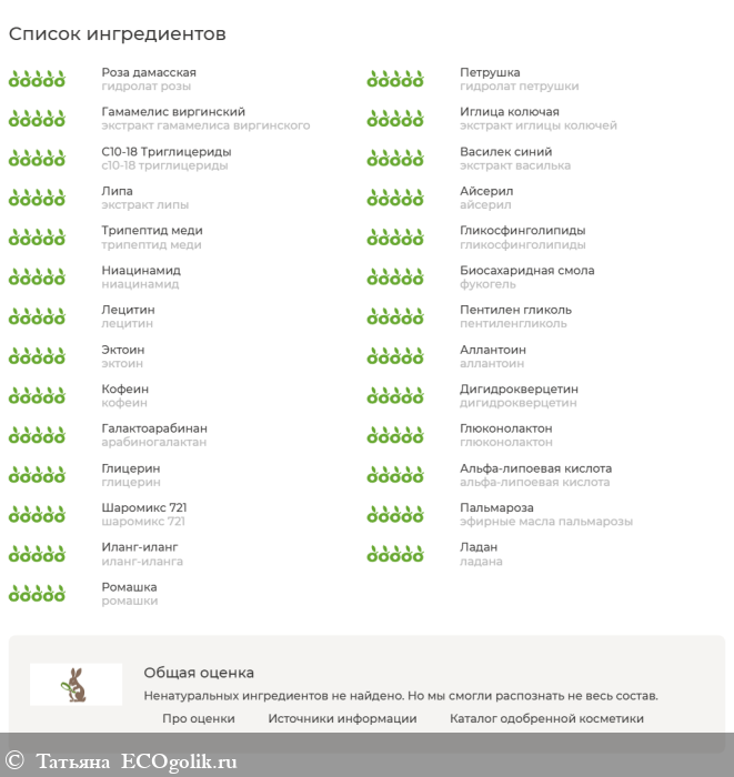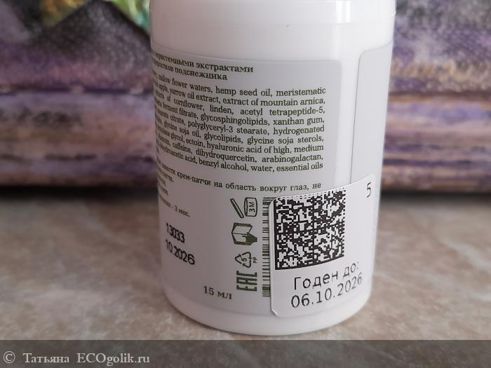 купаж гидролатов василька, розы, петрушки, земляники, мальвы; масла конопляное, меристемные экстракты почек сирени, подснежника, почек дикой яблони, мацерат тысячелистника, экстракты арники горной, гамамелиса виргинского, иглицы колючей; с10-18 триглицериды, экстракты василька, липы, пептиды: айсерил (acetyl tetrapeptide-5), айлисс (dipeptide-2), экстракт комбучи, трипептид меди (copper tripeptide-1), ламинария биоферментированная, гликосфинголипиды, инстантикс, гелиофил, мембранно-липидный комплекс (фосфолипиды, гликолипиды, глицин сои, фитостеролы, витамин F), ниацинамид, фукогель, лецитин, пентиленгликоль, эктоин, гиалуроновая кислота высокой, средней и низкой молекулярной массы, альфа глюкозил гесперидин; аллантоин, кофеин, дигидрокверцетин, арабиногалактан, глюконолактон, л глутаминовая кислота, глицерин, альфа-липоевая кислота, шаромикс 721, эфирные масла пальмарозы, иланг-иланга, нарда, ладана, ромашки.
