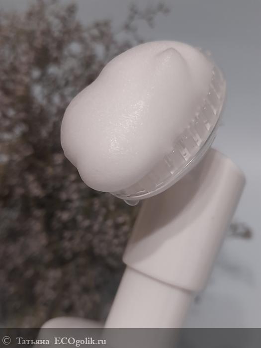 Я использую эту пенку два раза в день - утром и вечером. Наношу ее на влажную кожу лица с помощью силиконовой щеточки. Мягкими круговыми движениями обрабатываю кожу лица и шеи несколько минут и смываю остатки средства водой комфортной температуры. Никогда не умываюсь горячей водой.