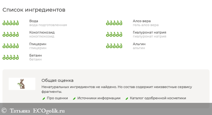 Состав совершенно натуральный. В нем нет никаких неприятных компонентов. В него входит: вода подготовленная, аквабиолис, гель алоэ вера, кокоглюкозид, гиалуронат натрия, глицерин, альгин, бетаин