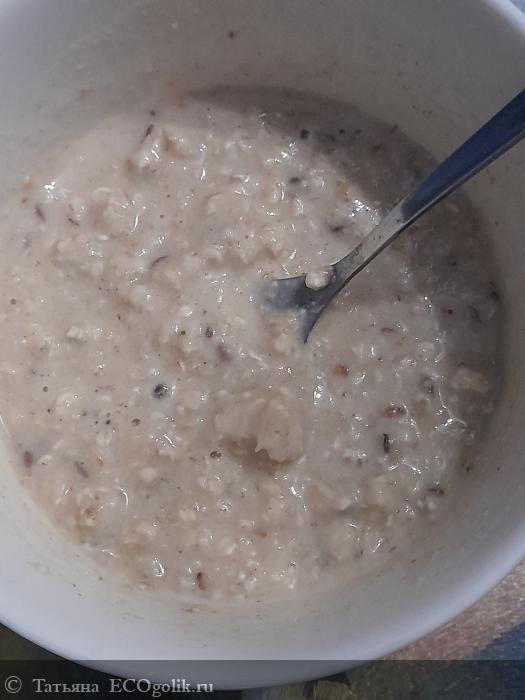 Кашка выглядит отлично. Она быстро готовится. Просто высыпаю кашу в емкость и добавляю 150 мл горячего молока. Пару минут и вкусный завтрак готов.