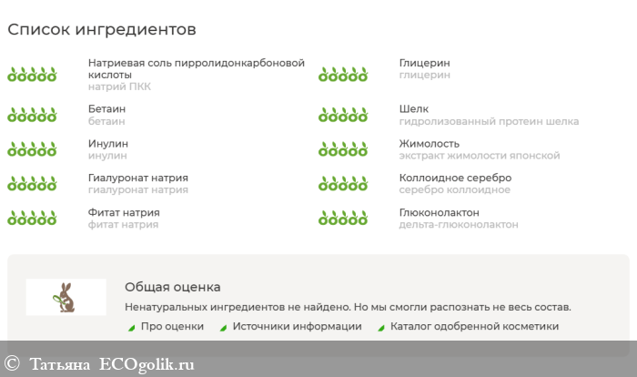 Гидролат розы галльской, натрий ПКК*, глицерин (растительный), бетаин (натуральный свекольный), гидролизованный протеин шелка, инулин, экстракт жимолости душистой, экстракт жимолости японской, гиалуронат натрия, серебро коллоидное, фитат натрия*, дельта-глюконолактон.