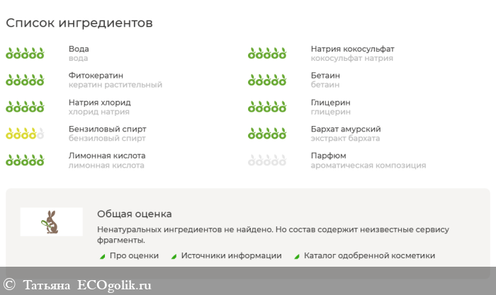 вода, кокосульфат натрия, динатриякокоамфодиацетат, (пропандиол, аргинин, молочная кислота, экстракт зародышей сои, экстракт шлемника, экстракт ростков пшеницы, бензоат натрия, глюконолактон, глюконат кальция (Baicapil)), кератин растительный, бетаин, хлорид натрия, коко-глюкозид/глицерилолеат, глицерин, бензиловый спирт, этилгесилглицерин, экстракт бархата, лимонная кислота, ароматическая композиция.