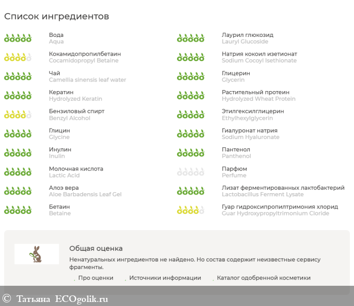 Aqua, Lauryl Glucoside, Cocamidopropyl Betaine, Rubus Idaeus fruit wate, Sodium Cocoyl Isethionate , Camellia sinensis leaf water, Glycerin, Hydrolyzed Keratin, Hydrolyzed Wheat Protein, Sodium Сitrate , Benzyl Alcohol, Ethylhexylglycerin, Glycine,Sodium Hyaluronate, Inulin, Panthenol, Lactic Acid, Perfume, Aloe Barbadensis (Aloe Vera) Leaf Gel, Lactobacillus Ferment Lysate, Betaine, Chamomilla Recutita Flower Exctract, Guar Hydroxypropyltrimonium Cloride.