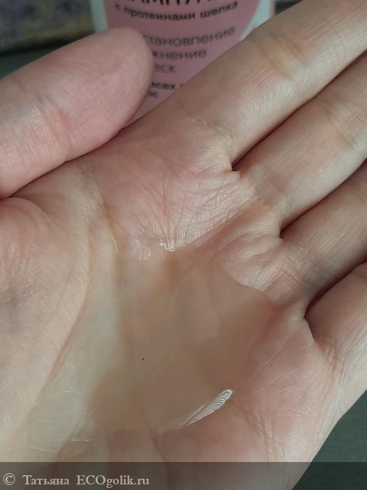 Шампунь прозрачный, практически бесцветный, есть еле уловимый золотистый оттенок, Густота средняя. Аромат приятный, косметический. Некоторое время ощущаю его на волосах.