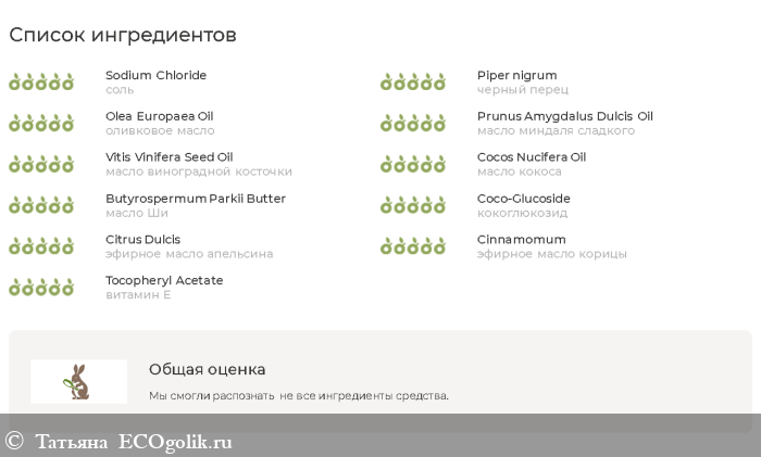 Полностью натуральный: соль, корень имбиря, черный перец, оливковое масло, масло миндаля сладкого, масло виноградной косточки, масло кокоса, масло Ши, кокоглюкозид, эфирное масло апельсина, эфирное масло корицы, витамин Е.